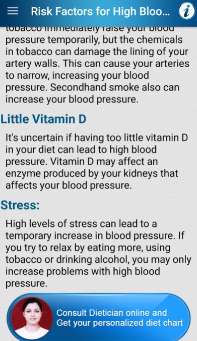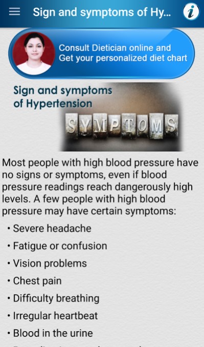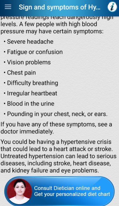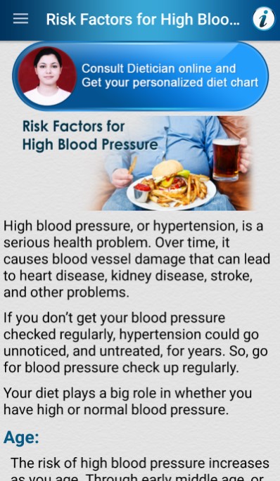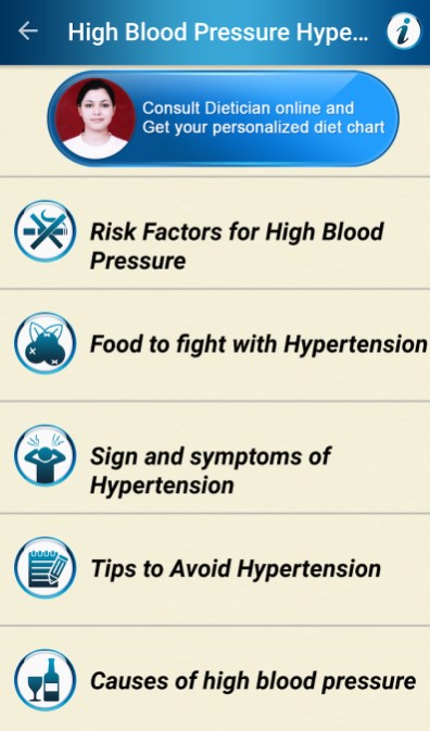 High Blood Pressure Diet Tips est une application gratuite spécialement conçu pour la haute BP Aide Conseils et de sensibilisation pour l'hypertension patients. App couvre des informations sur l'hypertension de l'hypertension artérielle comme les types provoque des facteurs de risque nourritures amicales et aliments à éviter, etc. Dieting idées et des conseils de cette application ont été soigneusement examinés par les diététistes expérimentés et professionnels soigneusement.